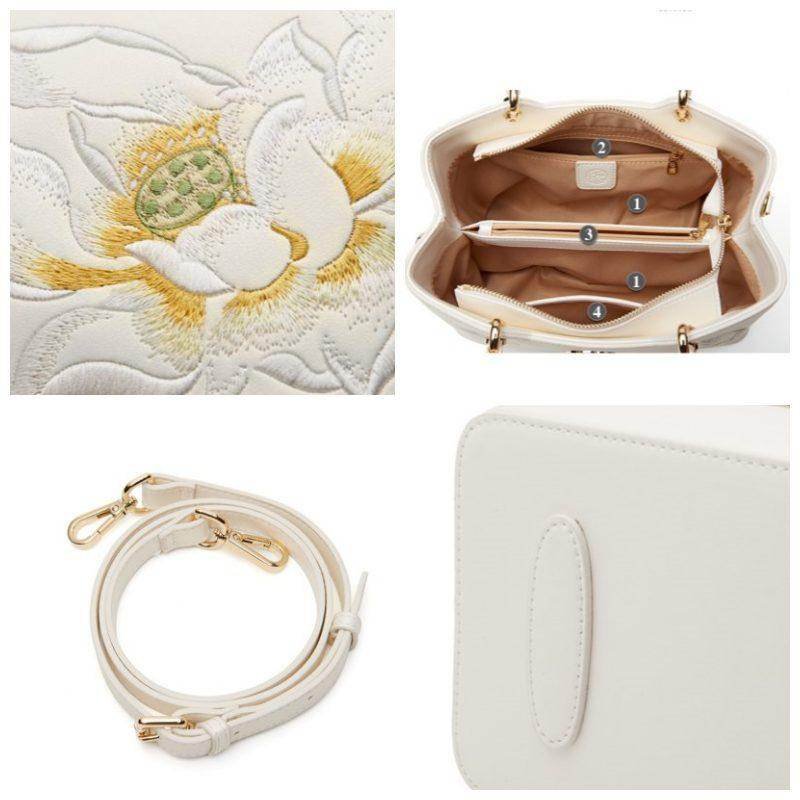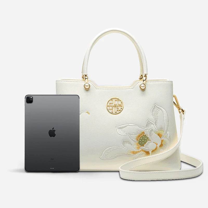 エンブロイダリーレザーホワイトクロスボディトートバッグロータスラグジュアリーギフト