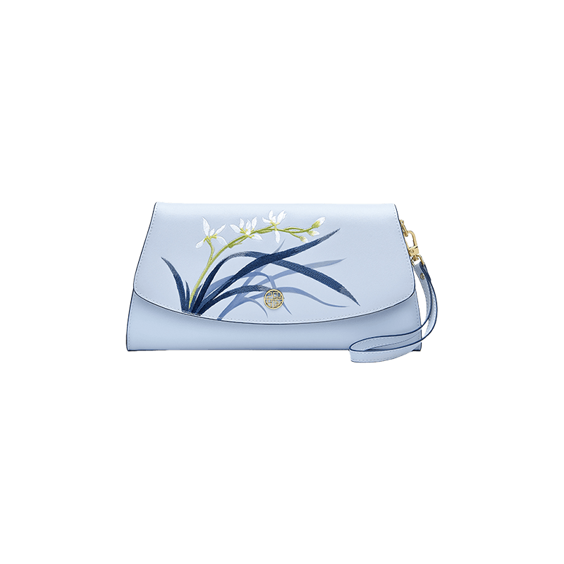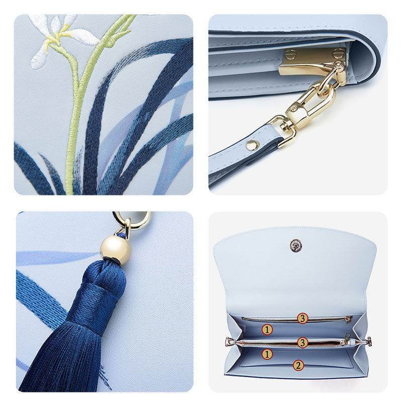 Embroidery Leather Clutch Bag Blue Orchid Elegant Handbag