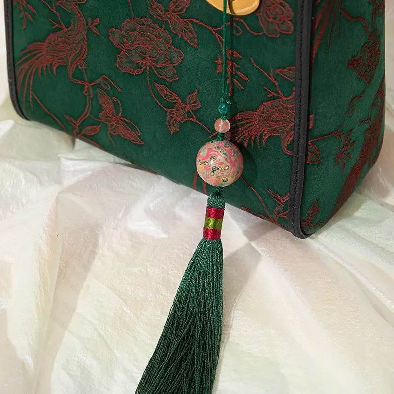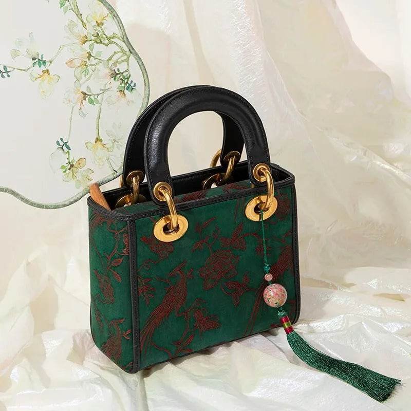Xiangyunsha Silk Green Retro Cowhide Handbag with Pendant